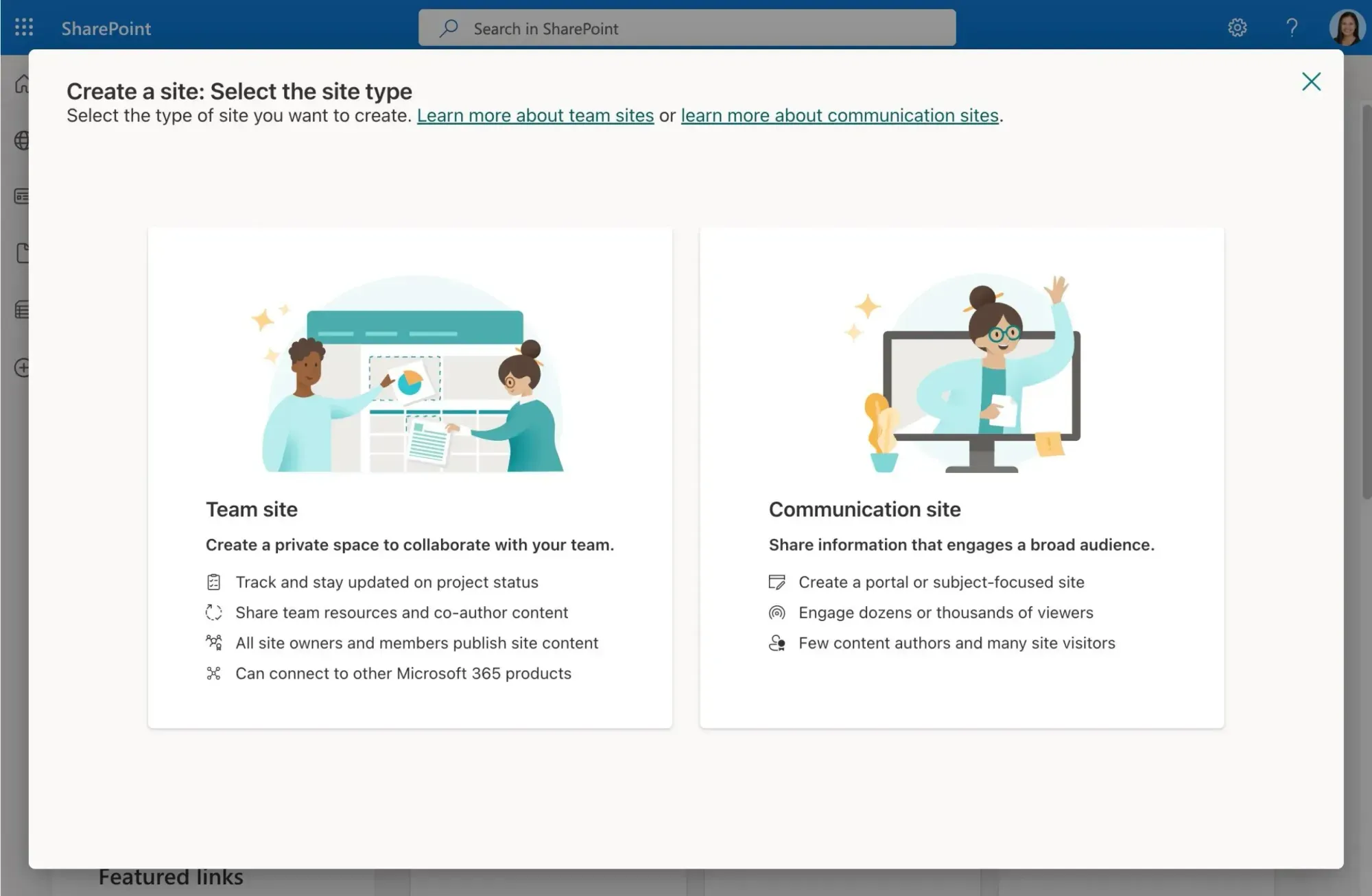 SharePoint comes in two distinct varieties: Communication sites and Team sites. For most businesses, you'll be working from a SharePoint Communication site. This is because a Communication site is designed for a large audience. A lot of users can access the site’s content but do not have to contribute to it. A Team site, on the other hand, is generally used if you expect a ton of collaboration and interaction on the site. It is designed to allow several people to be authors and contribute to the site's content.