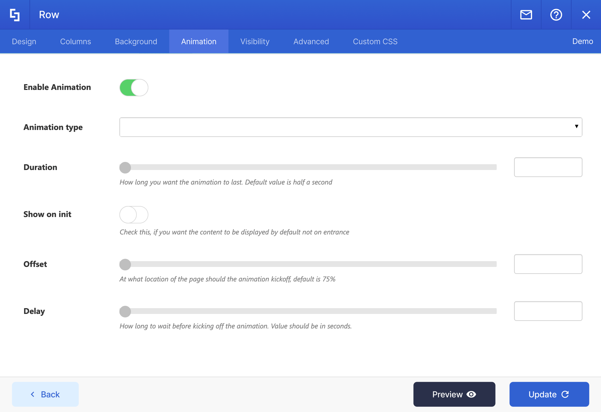 Draw your user’s eyes to a specific row of content by enabling animation. Choose from a wide selection of animations, set their duration, and modify other settings.