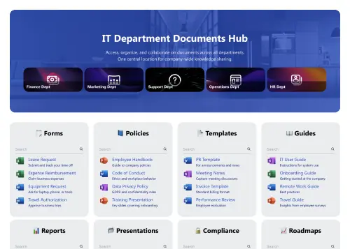 Clone the SharePoint document library template for HR, Finance, IT, or regions, tailoring content while preserving shared design