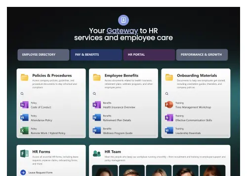 - 3Customize & Publish : Replace sample content with your own, connect your SharePoint data sources, apply your company branding, and publish your new HR intranet page for immediate use.