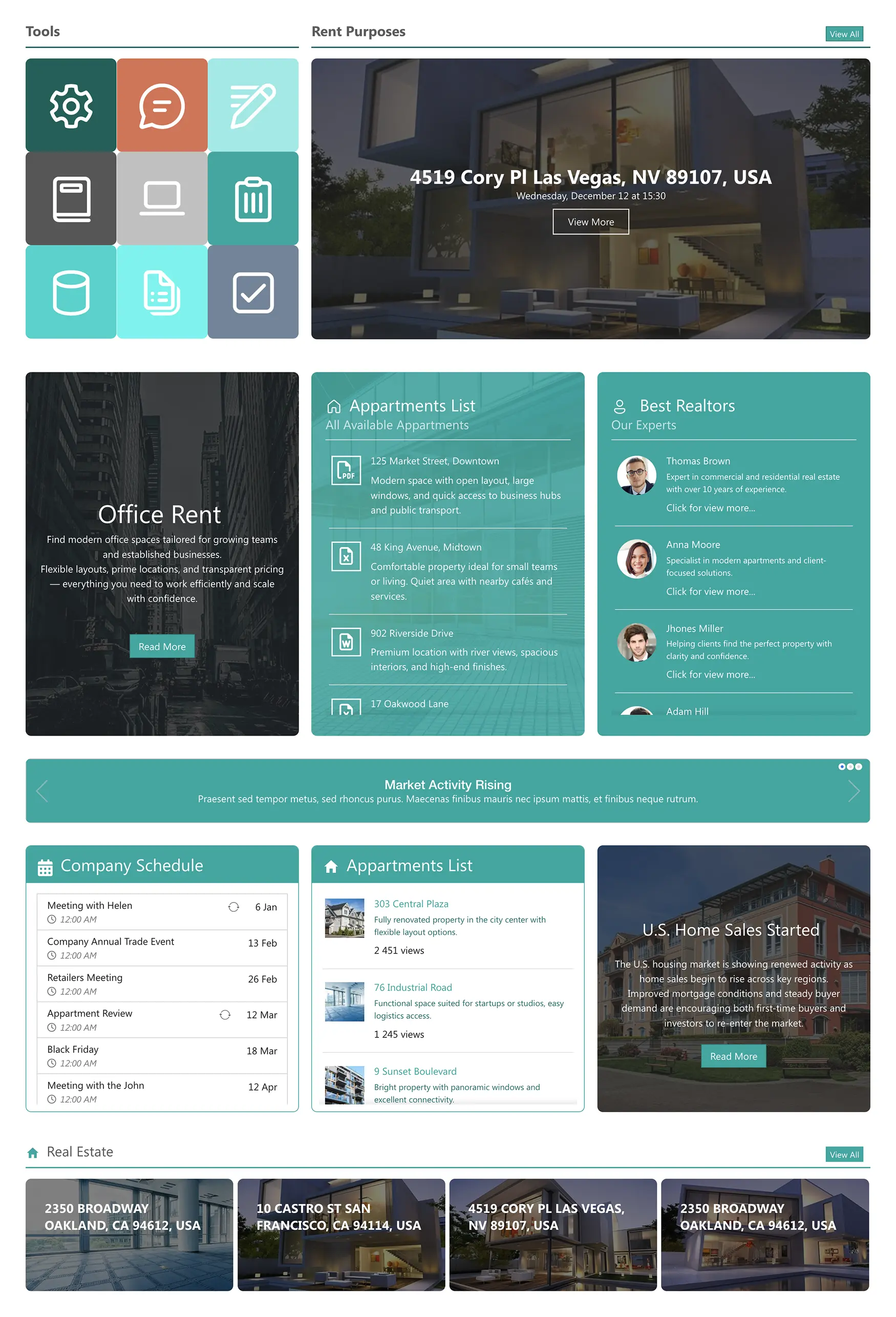 A rental-focused layout with tools, property details, apartment lists, top realtors, news updates, schedules, and property availability. Ideal for real estate companies that manage both rentals and internal team operations.