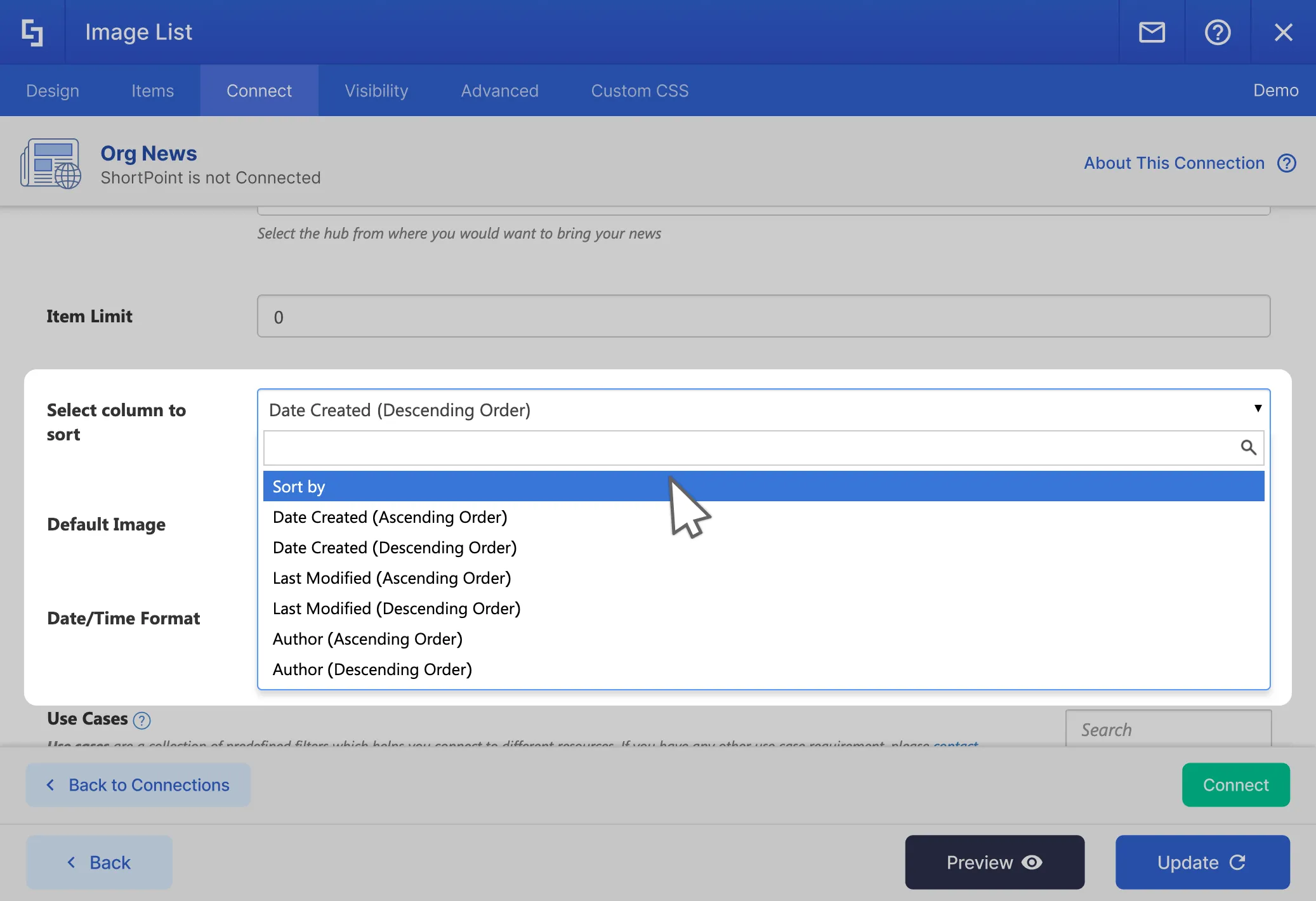 This field provides a quick sort functionality where you can sort content gathered from your news source by Title, Date Created, Last Modified, and Author, and select sorting in ascending or descending order.