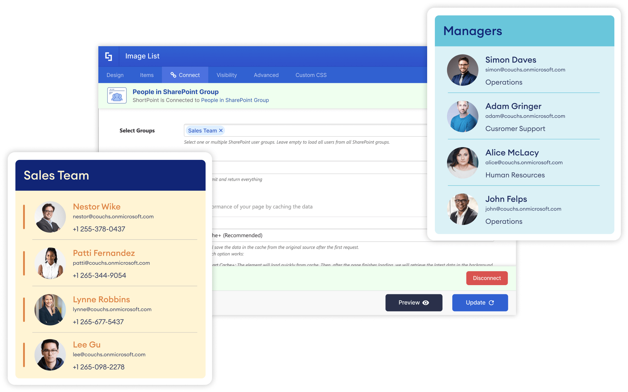 With the People in a SharePoint Group integration type you can display the information about the group members of your organization in SharePoint on the page.