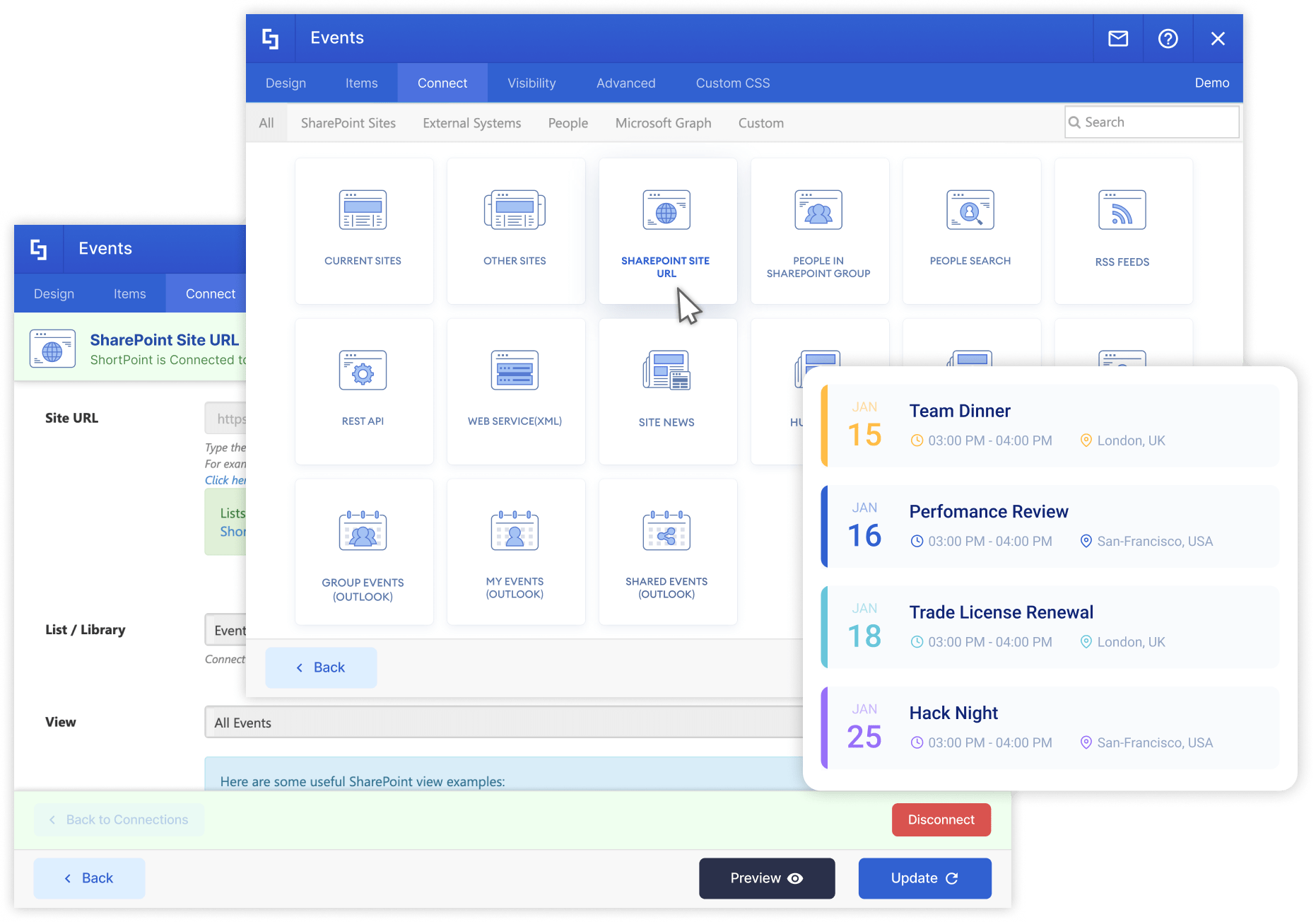 And allows you to connect to your Lists, Libraries and Calendars