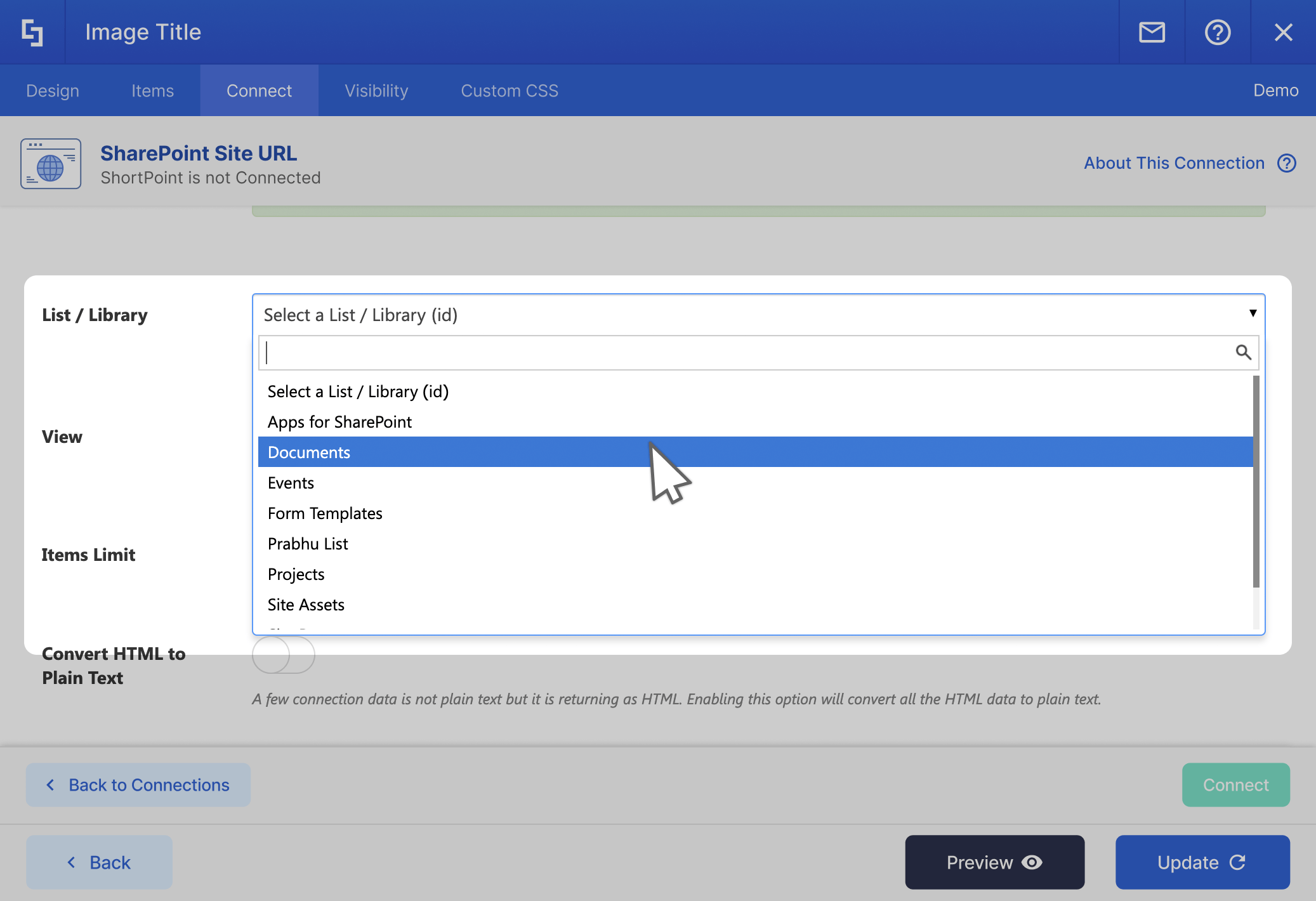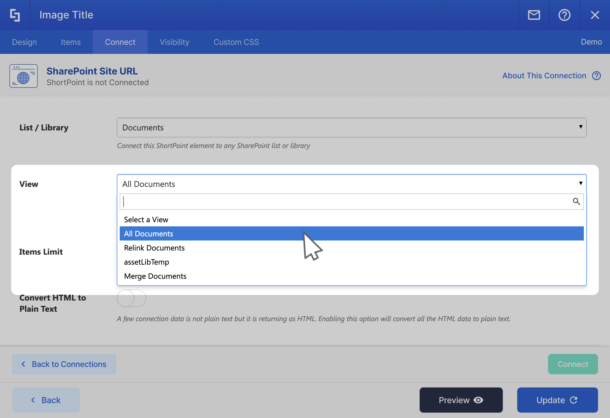 Connect to a particular view in your List or Library. You can use all the power of SharePoint View settings to feed your ShortPoint Elements.