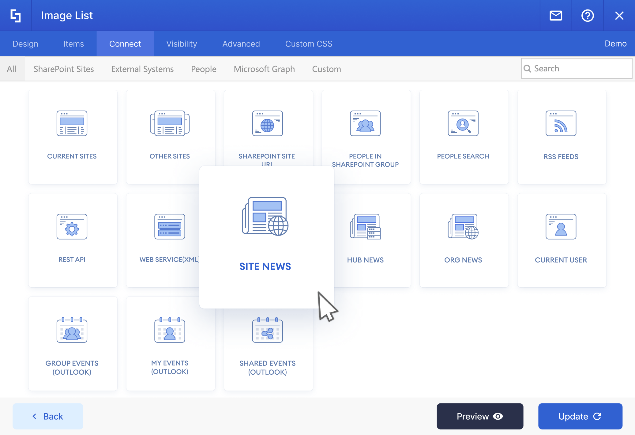This small but powerful connection brings News Posts and News links to your page from an entire SharePoint site collection