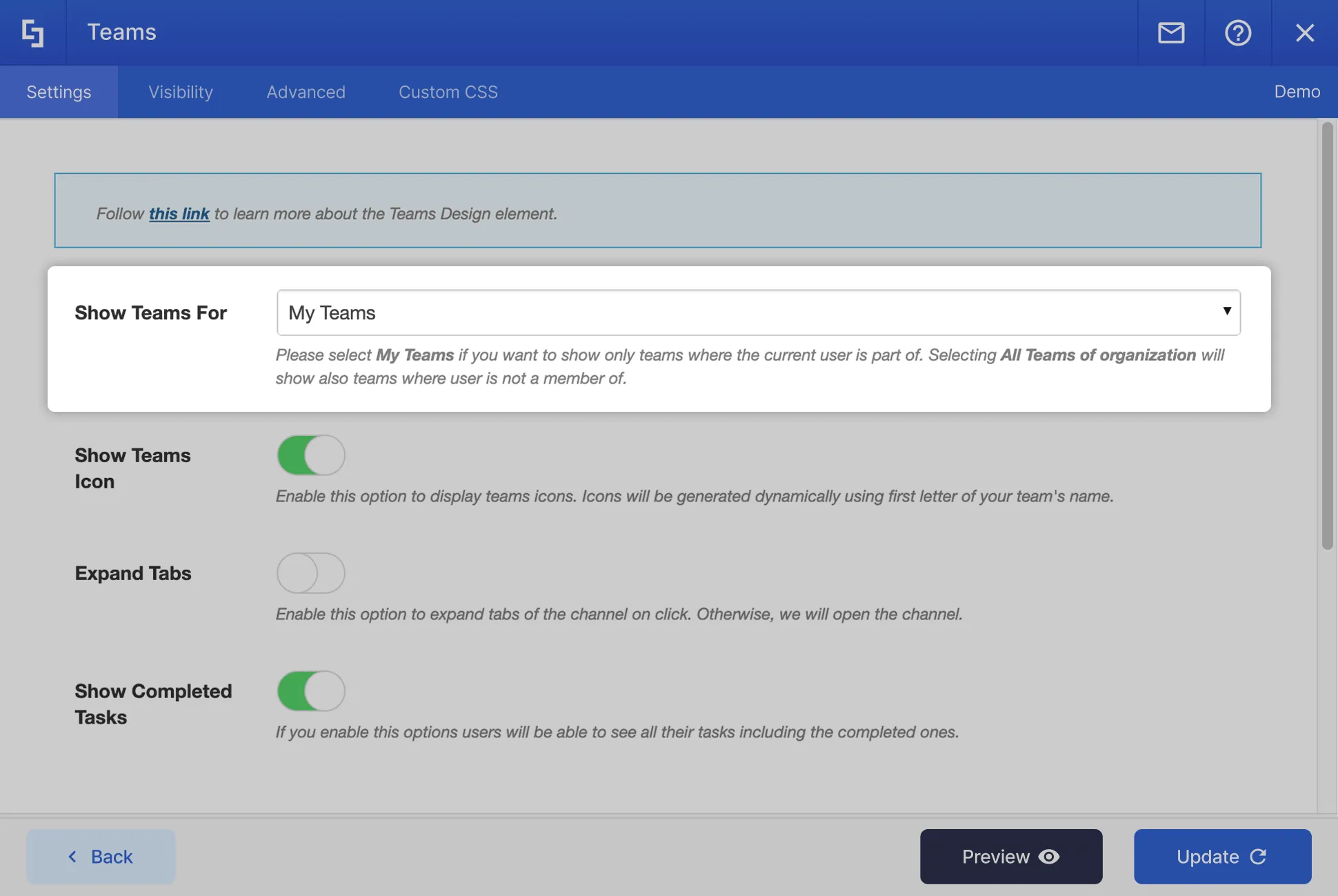 Using Teams design element you can quickly navigate between channels and open them in Teams app.